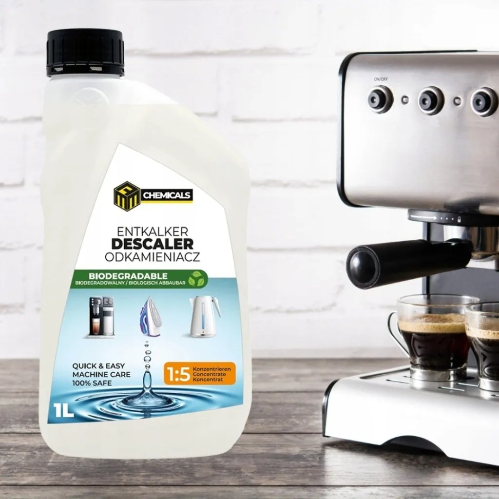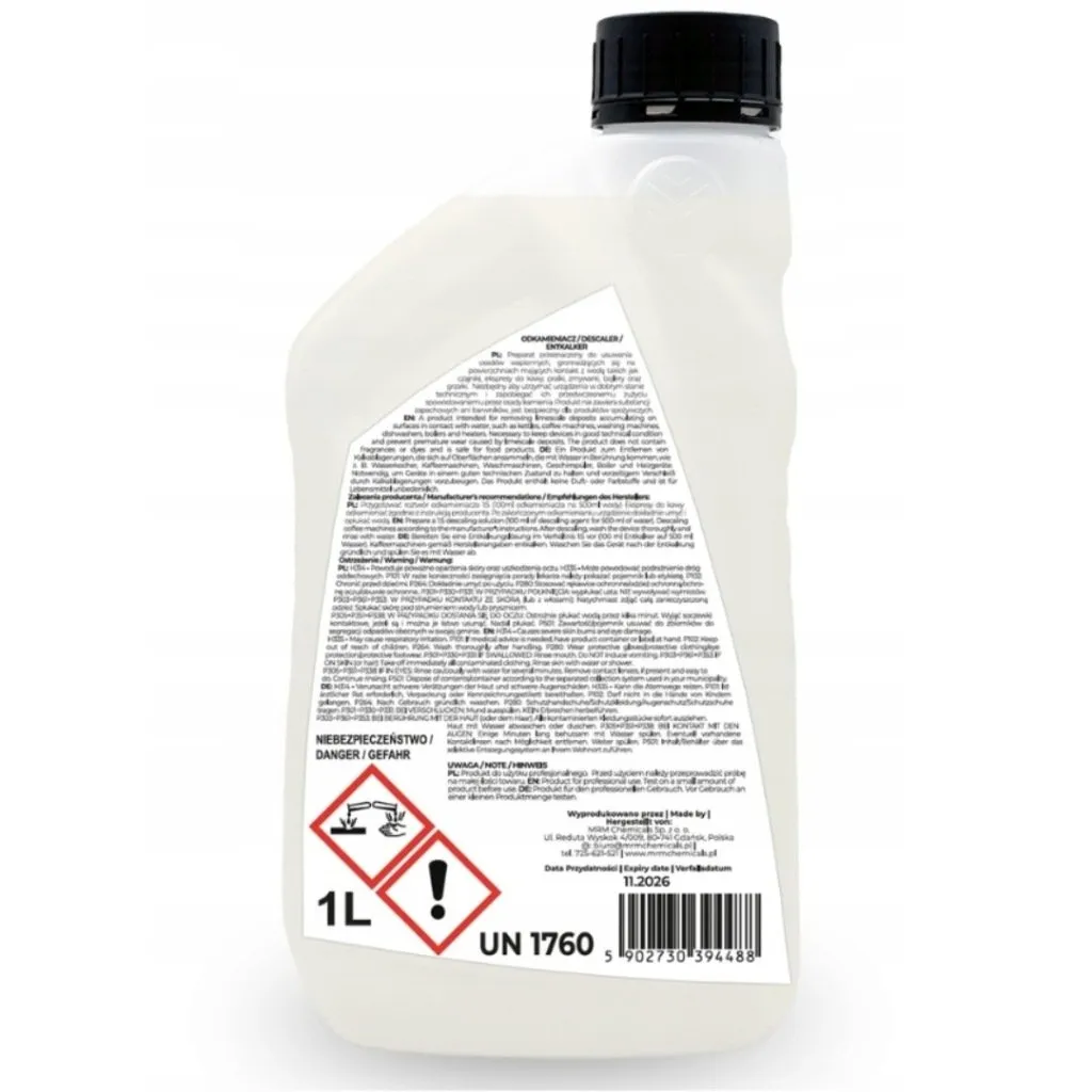 Płyn do odkamieniania w butelce 1000 ml, gotowy do rozcieńczenia. Stosunek rozcieńczenia: 1:5 do 1:10 w zależności od stopnia osadu. Przechowywać w temperaturze od +5°C do +25°C, z dala od dzieci i innych środków chemicznych. Nie mieszać z chlorem.
